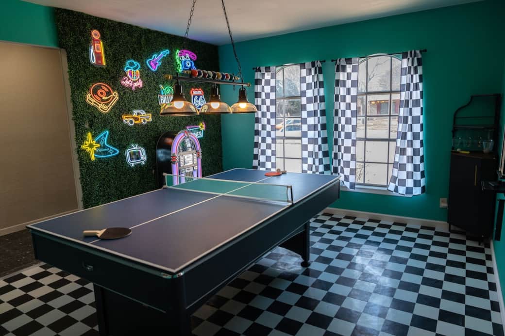 Ping pong table, Pool table, Sound system, Theme room, TV antenna, Record player